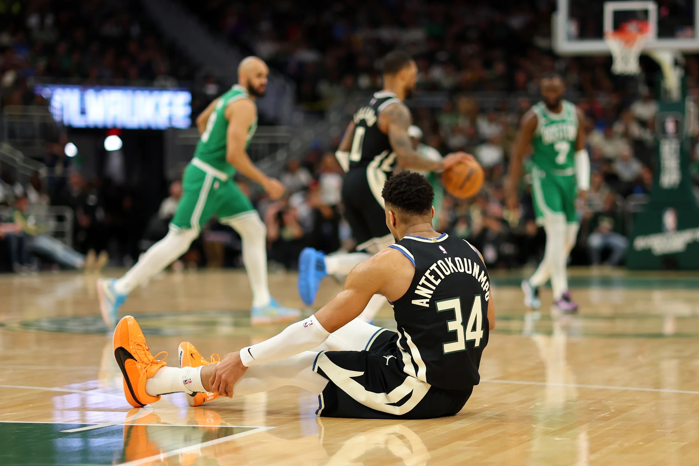 Milwaukee Bucks star Giannis Antetokounmpo went down due to an awkward, non-contact leg injury in th...