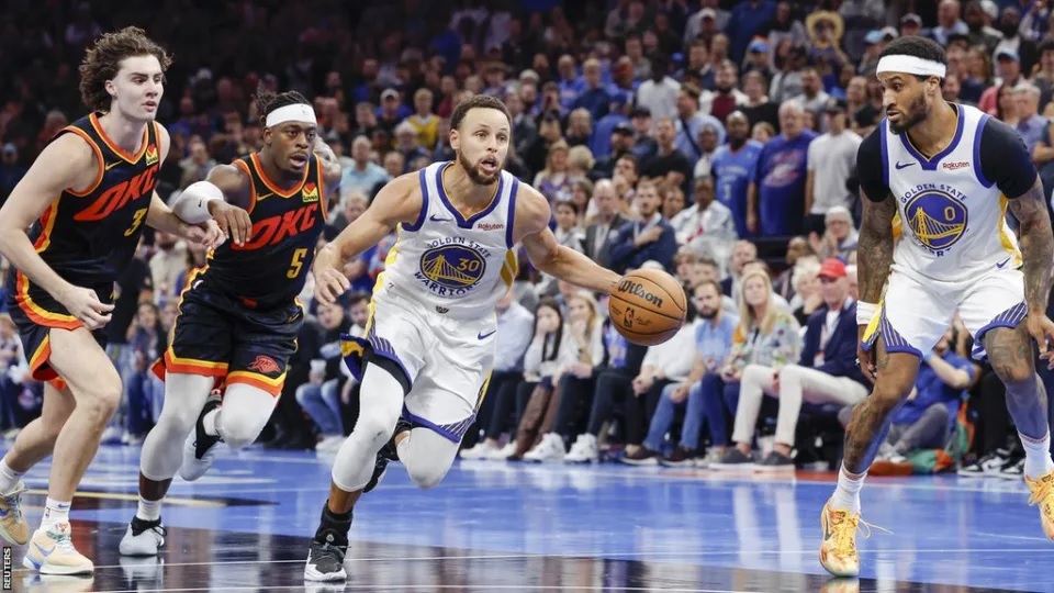 Stephen Curry scored with 0.2 seconds left as the Golden State Warriors beat the Oklahoma City Thund...