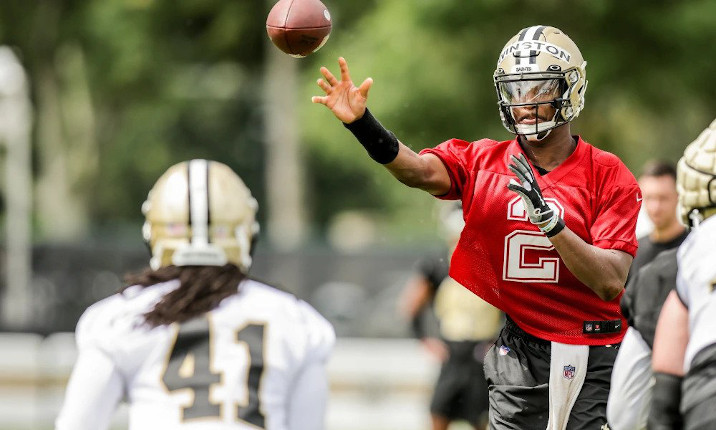New Orleans Saints quarterback Jameis Winston (foot) left training camp practice on Monday after inj...